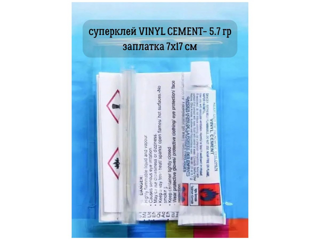 Ремкомплект (заплатка + суперклей VINYL CEMENT) для ремонта любых изделий из ПВХ: каркасные и надувные бассейны, матрасы, лодки, надыные круги и жилеты диваны, надувные игровые комплексы и т. д. Не получится отремонтировать только флокированную часть матраса. Ширина заплатки 7 см, а её длина равна 17 см. Процесс ремонта максимально прост: 1. Вырезать заплатку нужного размера круглой или овальной формы чтобы на 1,5-2 см заходила за края повреждения.