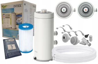 В комплект входит картриджный фильтр-насос Intex Krystal Clear (26638) производительностью 3785 л/час. Насос пропускает воду через картриджный фильтр тип А (входит в комплект), где и остаются все загрязнения (сор, листья, пыль, грязь). Подключение к штатным отверстиям бассейна осуществляется при помощи двух гофрированных шлангов диаметром 32мм. Напряжение 220-240 Вольт, длина сетевого шнура 190 см.