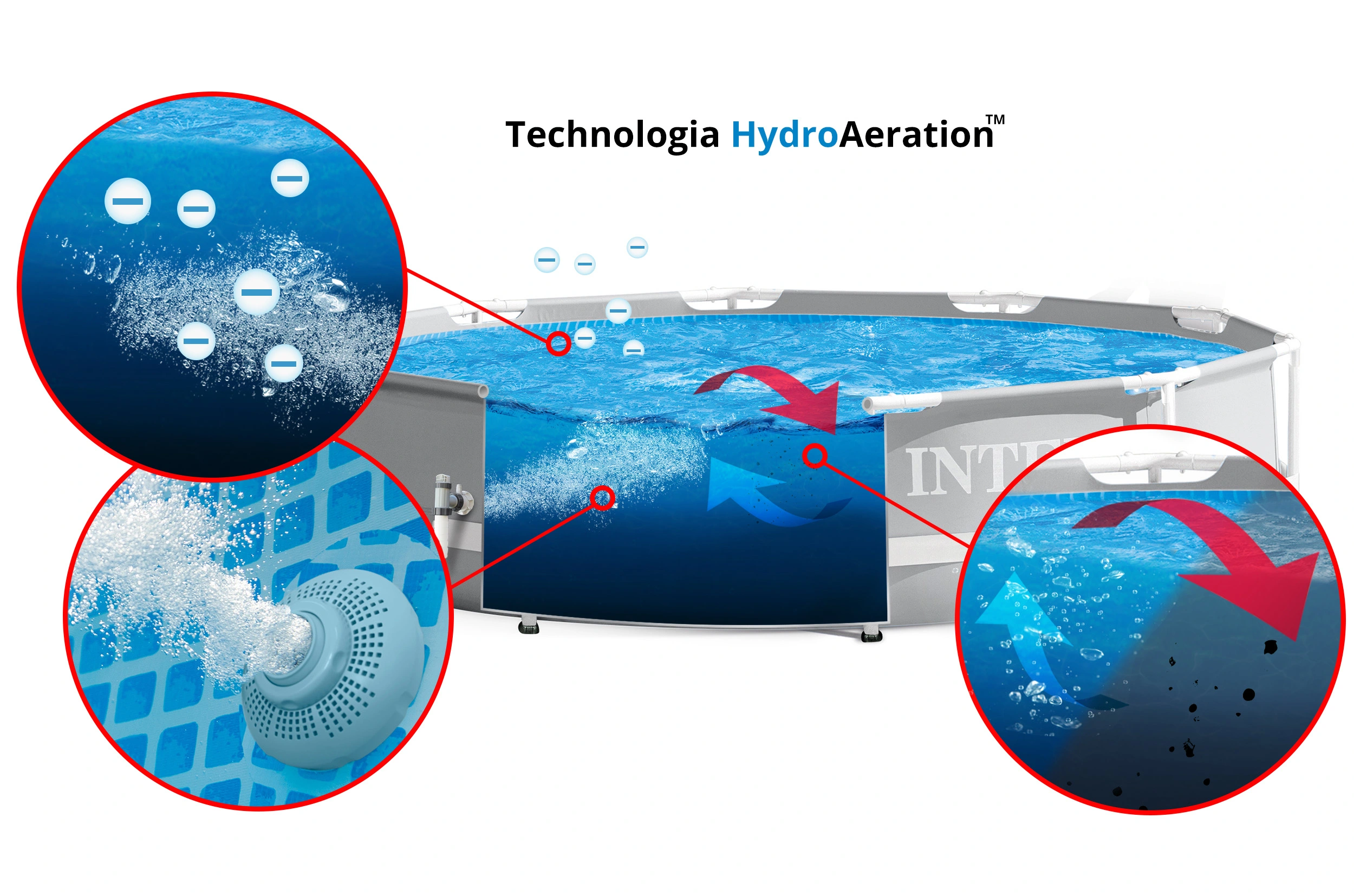 Благодаря инновационной системе Hydro Aeration Technology мелкие частицы в воде слипаются и оседают на дно, что облегчает их фильтрацию и удаление из воды. Путем смешивания воздуха и воды, процесс аэрации вызывает окисление железа и марганца, что устраняет окрашивание воды. В результате сверкающая вода в бассейне, в котором вы чувствуете себе прекрасно. Отрицательные ионы делают воздух вокруг бассейна более свежим, так как удаляют из него загрязнители и нейтрализуют свободные радикалы, которые влияют на его качество.