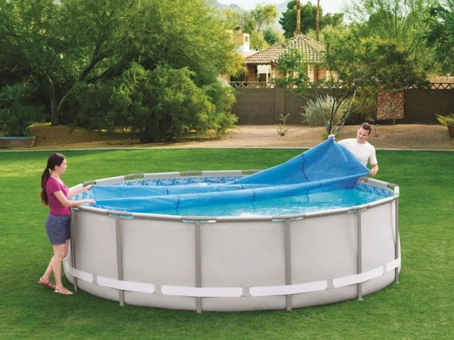 Плавающее покрывало для каркасных и надувных бассейнов размером 305 см от компании Intex. Обогревающее покрывало представляет собой прозрачную пленку голубоватого оттенка ячеистой структуры диаметром 290 см, которая не препятствует прохождению солнечных лучей и позволяет воде прогреваться гораздо быстрее. Кроме того, покрывало замедляет остывание воды в бассейне, уменьшает ее испарение, предотвращает попадание грязи на поверхность воды. Покрывало удобно использовать вечером - за ночь вода остынет меньше, а уже с первыми лучами солнца она начнет нагреваться.