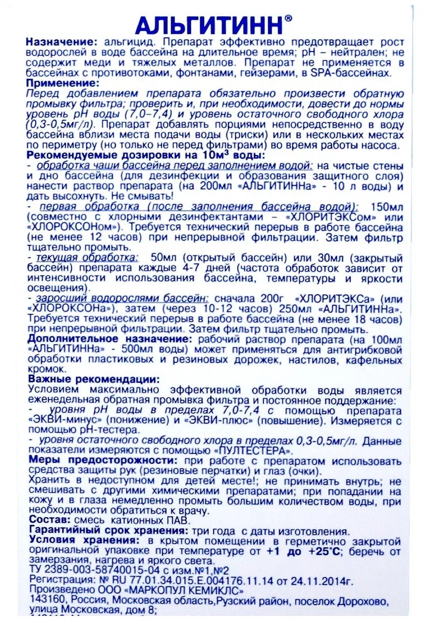 | Расход препарата | Предварительная обработка: на стены и дно бассейна (для дезинфекции и образования защитного слоя) нанести раствор препарата (на 200мл Альгитинна 10 л воды) и дать высохнуть; текущая обработка: 50мл (50г) на 10м3 воды (открытый бассейн) и 30мл (30г) на 10м3 воды (закрытый бассейн) один раз в три дня; "ударная" обработка: 150мл (150г) на 10м3 воды - по мере необходимости. |