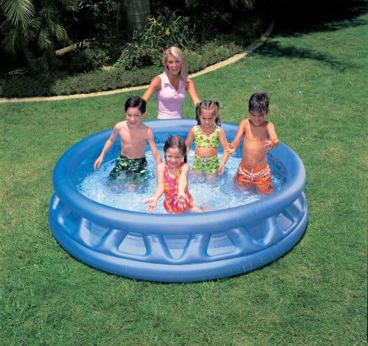 Надувной бассейн для детей Intex Soft Side – это достаточно большой, прочный и удобный бассейн, напоминающий летающую тарелку, предназначен для использования во дворе дома или на дачном участке. Диаметр его 188 сантиметров, а высота 46 сантиметров. Это просторный бассейн на 880 литров воды, в котором могут разместиться три-четыре малыша и при этом комфортно себя чувствовать играя в воде. Созданный из трёхслойного винила, бассейн обладает высокой степенью надежности – надувные стенки придают безопасность каждому моменту, позволяя детям наслаждаться весельем в полной мере.